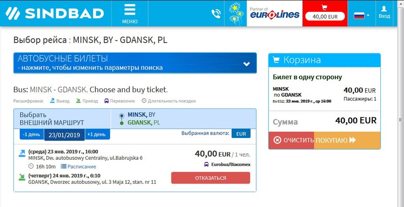 На рейсы Sindbad Eurobus — 98 белорусских рублей (40€) в одну сторону.