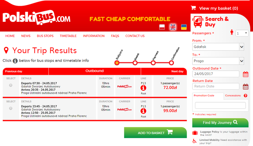 Билеты на автобус продаются на автовокзале в Гданьске ил на сайте Polskibus.