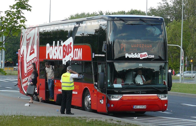 Автобусные перевозки выполняет фирма Polski Bus. У ее автобусов ливрея вот такая:
