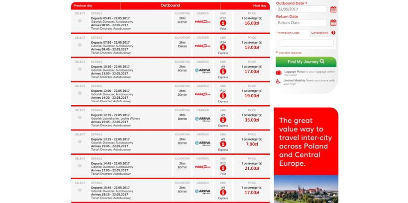 Автобусное сообщение в Польше играет важную роль, выступая дешевой альтернативой железной дороге. В данном случае основным перевозчиком будет компания Polski Bus, автобусы которой выглядят так: