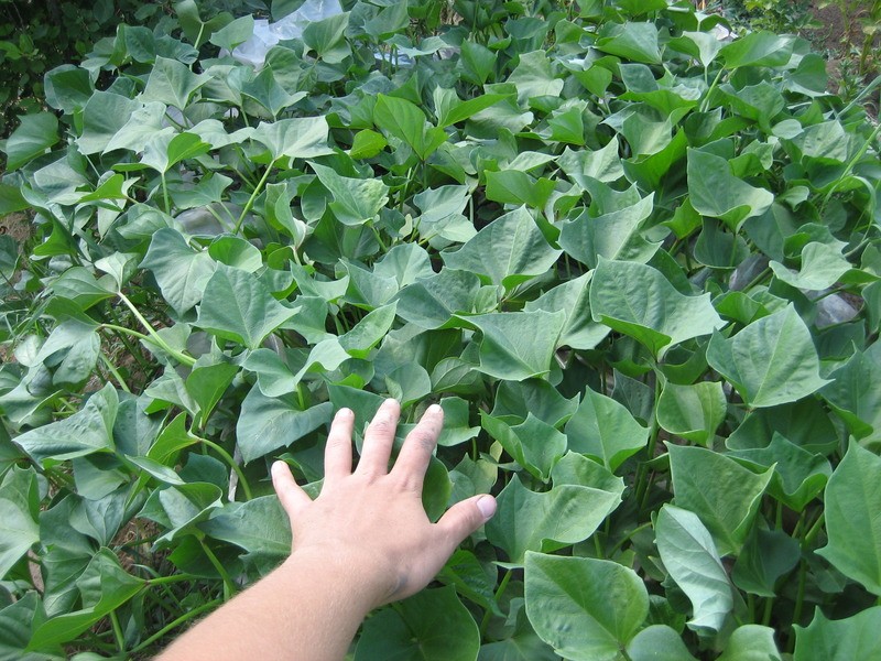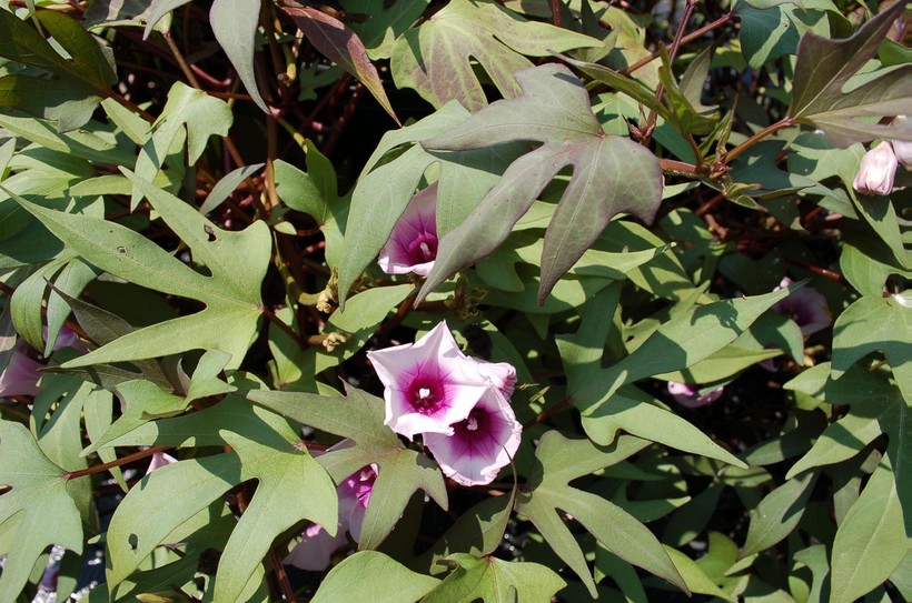 Не знаю, почему батат называют «сладким картофелем», ведь они даже дальними родственниками не являются. Разве что формой клубней батат напоминает нашу родную картошку. А в остальном… Батат — это лиана, трава с длинными (до пяти метров) стелющимися стеблями и довольно крупными листьями. Внешне само растение похоже не на картофельный куст, а, скорее, на плети тыквы или огурцов. Только съедобные клубни образуются не на месте цветка, а в земле, как и картошка. Впрочем, когда батат цветет, он вообще очень сильно напоминает вьюнок-переросток, и ни за что не подумаешь, что в нем есть что-то съедобное.