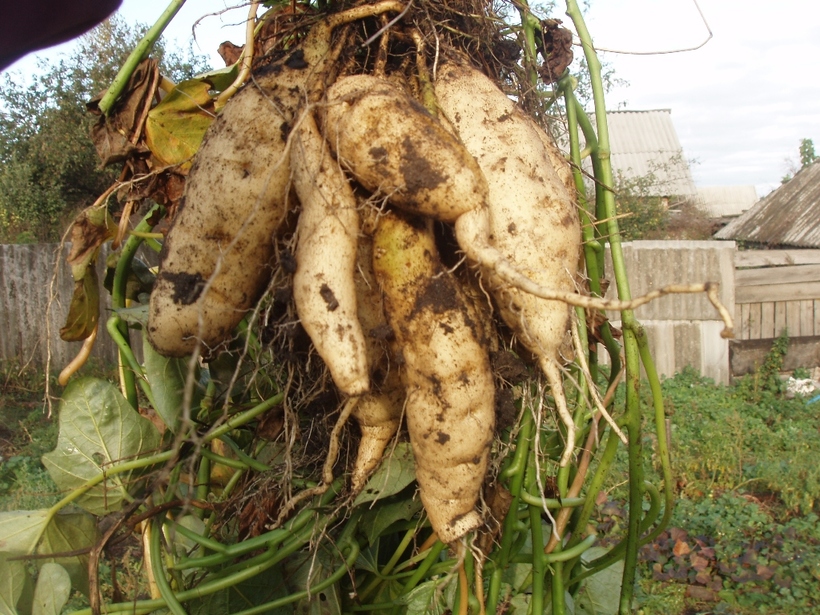 Я сразу же вспомнил о топинамбуре, который растет на даче. Топинамбур очень похож по описанию на батат: