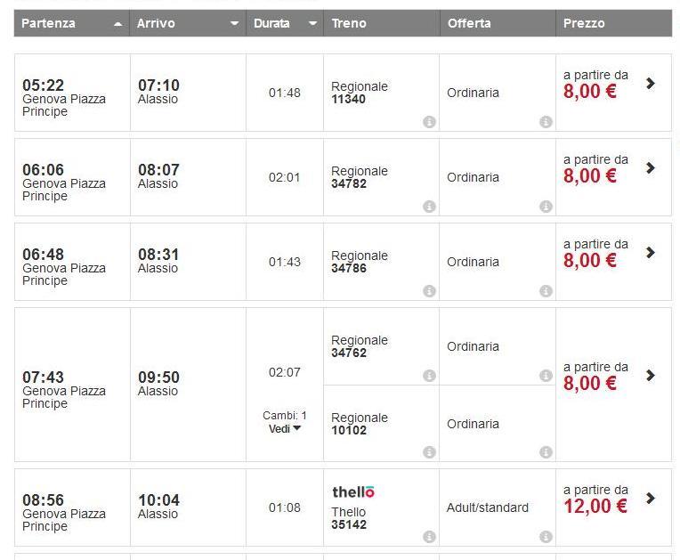 Между городами курсируют, преимущественно, составы категорий Regionale и Intercity. Есть пара поездов класса Thello, но билеты на проезд в них существенно дороже, чем на путешествие в обычных составах.