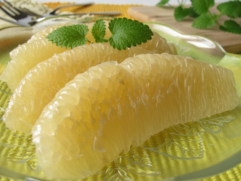 - тщательно удалите с долек беловато-прозрачную оболочку и перепонки,которые свойственны всем цитрусовым, у помело они жесткие и сильно горчат.