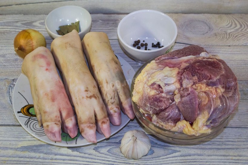 Основные ингредиенты – это говяжьи ножки и рубец. Ножки тщательным образом опаливают, чистят, моют и замачивают в воде. Эту воду неоднократно меняют на протяжение 2-3 дней. Затем можно приступать к тому, чтобы варить говяжьи ножки и рубец сначала по отдельности, а затем - в общей посуде.