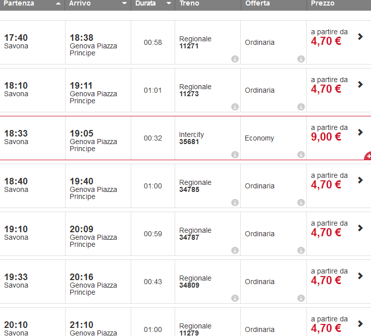 Между Савоной и Генуей курсирует масса поездов различных категорий. Первый состав выезжает в 04.40, последний – в 21.33. Интервал движения зависит от времени суток и составляет 10-40 минут.