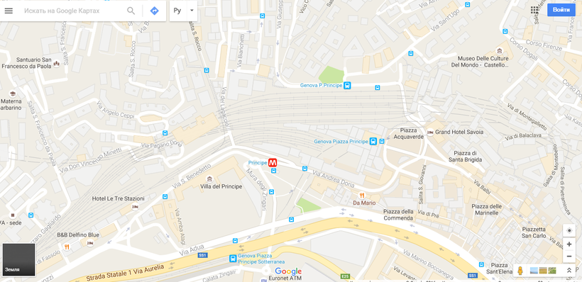 Обратите внимание, что в Генуе есть два железнодорожных вокзала: Генуя-Бриноле и Генуя-Принципе. Первый обслуживает, в основном, местные пригородные маршруты, а поезда в сторону Пизы отправляются с вокзала Генуя-Принципе. Вокзал расположен по адресу Via Andrea Doria, 5, ниже на карте видно его месторасположение.