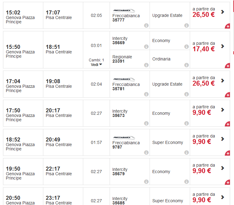Между городами ежедневно курсирует масса поездов категорий Frecciabianca, Intercity и Regionale. Первый состав отправляется в сторону Пизы в 05.49, последний – в 23.57. Такое расписание очень удобно для путешественников, которые едут из Генуи посмотреть Пизу и наоборот, возвращаются в Пизу после экскурсии по Генуе.