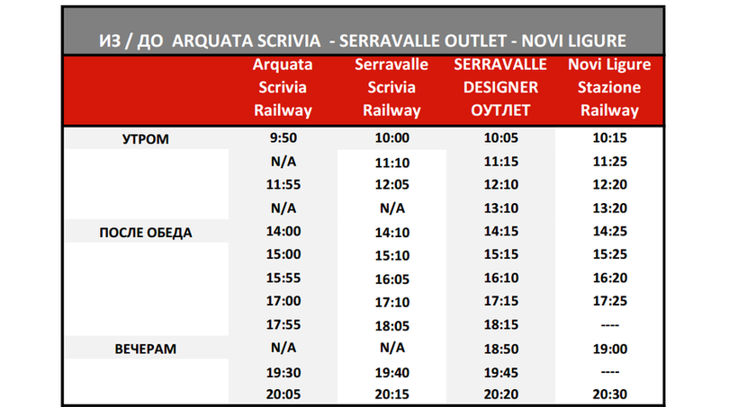 От станции Arquata Scrivia автобус отправляется в 09:50, 11:55, 14:00, 15:00, 15:55, 17:00, 17:55, 19:30, 20:05. Минут через 5-7 транспорт останавливается на станции Serravalle Scrivia, а еще минут через 10 – возле входа в аутлет.