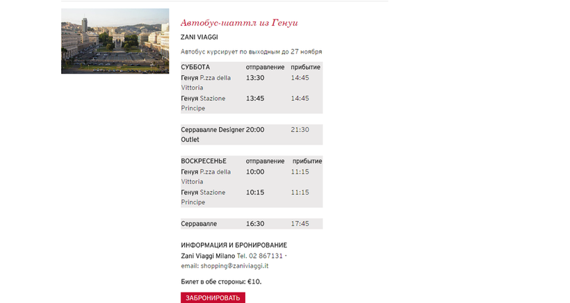 Из Генуи шаттлы выезжают только по выходным и то раз в сутки. Автобус отправляется с P.zza della Vittoria в субботу 13:00, делая остановку на Stazione Principe в 13:45. В Серравале он прибывает в 14:45. По воскресеньям шаттл отправляется в 10:00, прибывая в аутлет в 11:15. На покупки выделяется 5 часов. В принципе, этого времени достаточно, если заранее решить, что именно вы хотите приобрести.