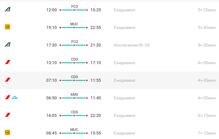 Стоимость билетов будет зависеть от выбранной авиакомпании, пункта пересадки и даты полёта. Чем больше будет времени до полёта – тем дешевле будет стоимость билета. Разброс цен на авиабилеты достигает от 270 до 719 евро.