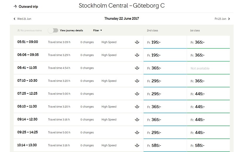 Билет на поезд стоит от 20 евро, обычно эта цена распространяется на утренние рейсы. В среднем поездка в Гетеборг обойдется 30-40 евро. В поездах есть первый и второй класс, мне кажется переплачивать не стоит, во втором классе чисто и комфортно.