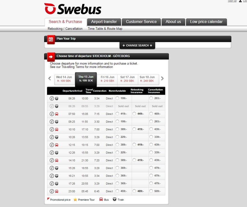Вот расписание Swebus, обратите внимание, что автобусы обозначены красным значком: