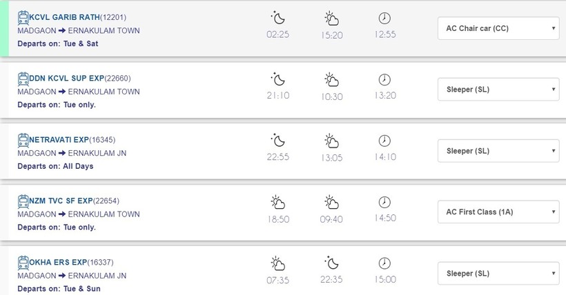Я ездила в Кералу (в город Кочин, его также называют Коччи) из города Маргао. Железнодорожная станция тут называется Madgaon. Ежедневно по этому маршруту ходит только 2 поезда. Первый отправляется в 18:50, а второй — в 19:40. Дорога займет примерно 15 часов. Также есть и другие рейсы, но они актуальны только по определенным дням недели.