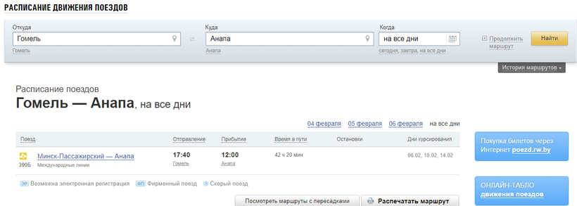Также добраться в Анапу можно и по железной дороге. Маршрут поезда Минск — Анапа почти ничем не отличается от автомобильного маршрута через Брянск. Дни отправления поезда со станции Минск-Пассажирский до станции Анапа одинаковы каждый месяц. Это 2, 6, 10, 14, 18, 22, 26 и 30 числа. Из Гомеля поезд отправляется в 17:40. В пути вы пробудете 1 день 18 часов, что на 20 часов дольше поездки на автомобиле. Большой плюс — это то, что поезд прибывает всегда в 12:00 дня по московскому времени.
