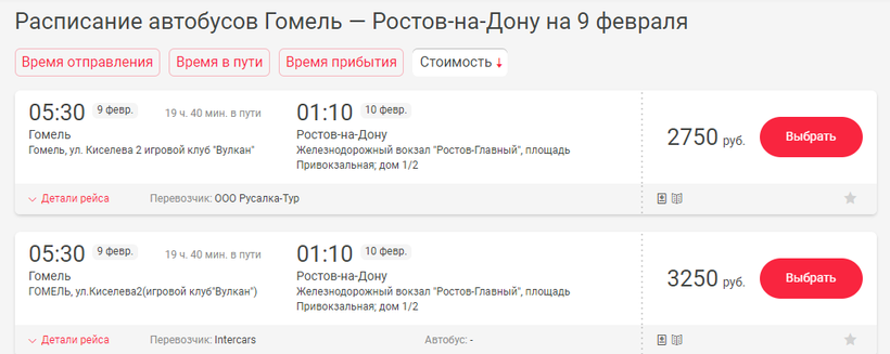 Стоимость проезда и время в пути