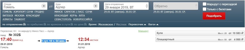 Из Гомеля в Адлер прямой поезд (№ 302Б) ходит только один раз ври дня. Отправляется он в 17:40, а прибывает в Адлер в 12:34 (весь путь займет 1 сутки 18 часов 54 минуты).