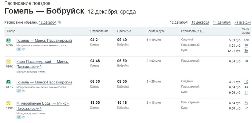 На поезде в Бобруйск ехать всего два с половиной часа. Правда, есть такие рейсы, где продолжительность остановок больше (сорок минут, полчаса), поэтому поездка может занять пять или шесть часов.
