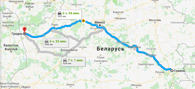 Гомель и Гродно разделяют 592 км, которые на машине можно преодолеть за 7 часов. Если автомобиля у вас нет, аренду его в Гомеле посмотреть можно, к примеру, тут.