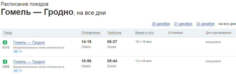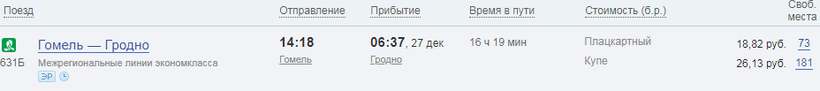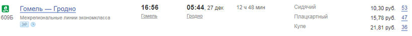 Стоимость билетов на оба поезда «Гомель — Гродно» разная. Поезд, отправляющийся в 16.56 дешевле, поэтому укажу цены на билеты в нем. Также стоимость билетов отличается в зависимости от типа вагона: