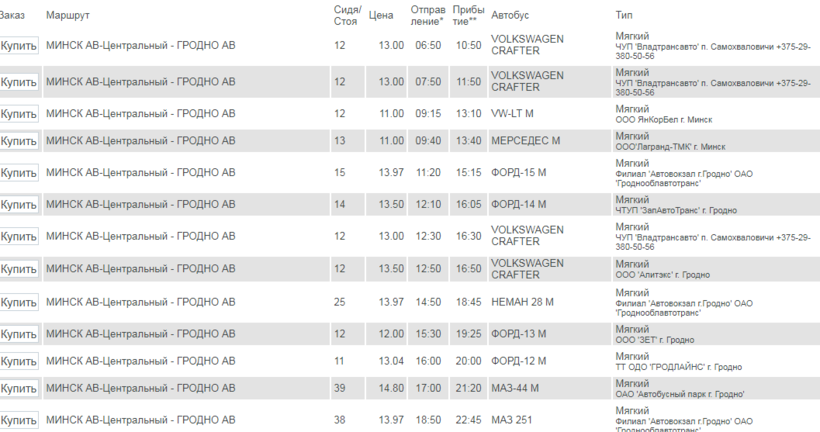 По маршруту Гомель-Минск курсируют в основном небольшие микроавтобусы на 15-20 мест, поэтому советую билеты покупать заранее. А из Минска до Гродно ездят как маршрутки, так и большие мягкие автобусы «МАЗ».
