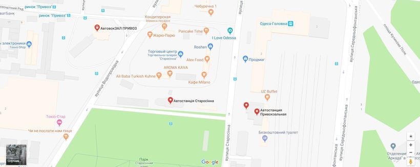 Один из автобусов прибывает на автостанцию Привоз. Её тоже видно на карте, она расположена на соседней улице. Все автобусы под эгидой Ecolines объединяет следующее: