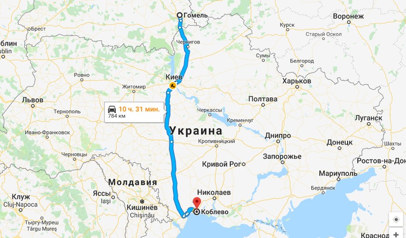 Гомель и Коблево разделяют 784 километра, которые на машине я преодолеваю примерно за 10 часов. Маршрут проходит через Чернигов, Киев, Белую Церковь, Умань и Одессу.