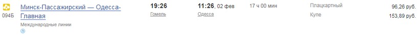 Билет на поезд от Гомеля до Одессы стоит 96,26 BYN (плацкартный вагон) и 153,89 BYN (купе). В рублях это получается 2927 и 4680 рублей.