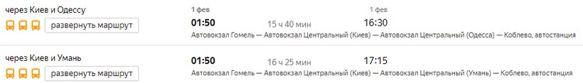 Есть 2 маршрута в ночное время. Оба автобуса отправляются из Гомеля в 01:50, пересадки в Киеве и Одессе, а также в Киеве и Умани. Время в пути 15 часов в первом случае и 16 часов во втором.