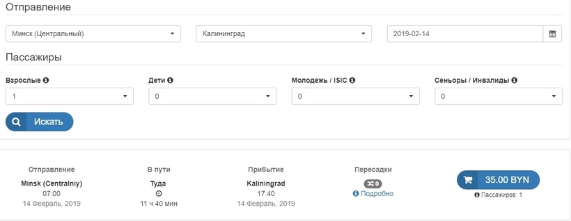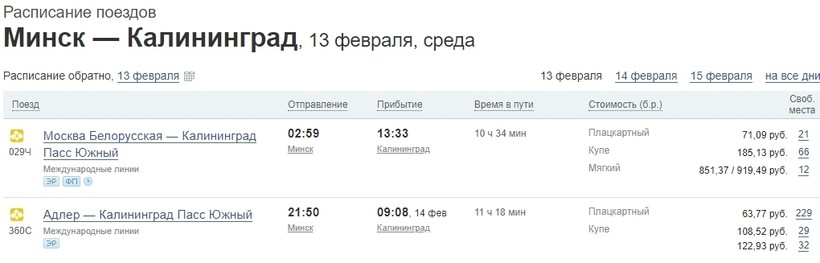 Из Минска в Калининград также ездят пассажирские поезда, правда, график здесь зависит от дня недели — может быть один рейс, а может и два-три.