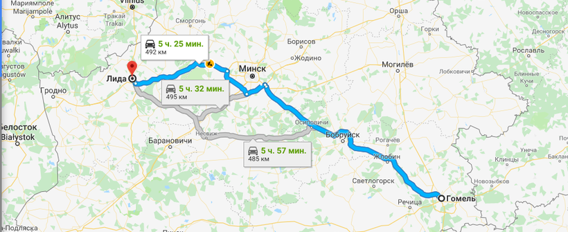 Гомель — Лида — маршрут на карте
