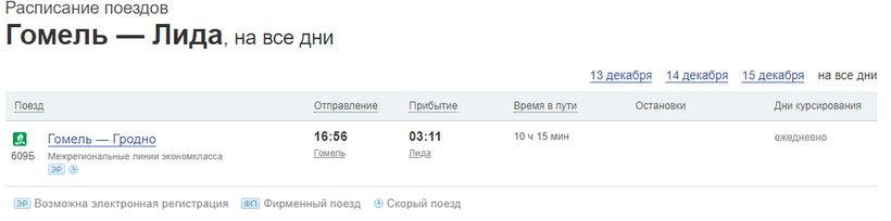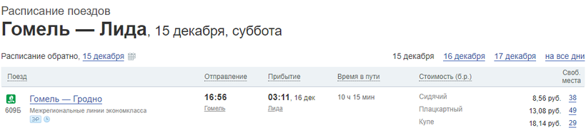 Стоимость билетов на поезд «Гомель — Лида» варьируется в зависимости от типа вагона: