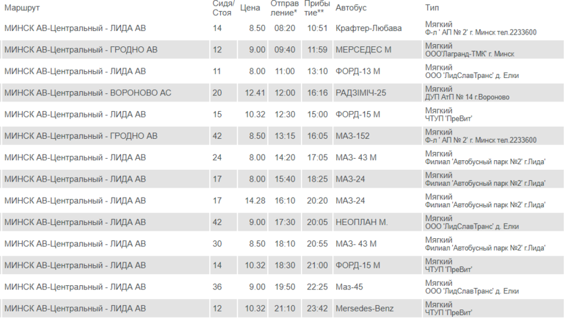 Проезд из Минска до Лиды обойдется от 8 до 14 BYN или 250-440 руб.