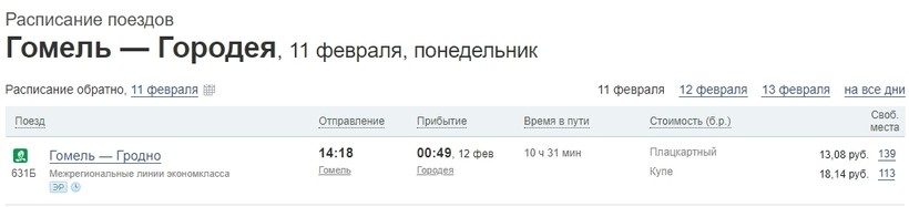 Билет на поезд из Гомеля в Городею обойдется от 13 белорусских рублей (400 российских рублей).