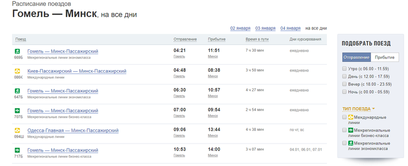 - поезд Гомель — Минск ≈ 10–22/300–700;
