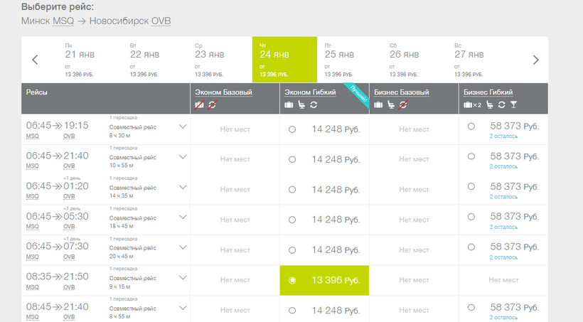 Рейсы Минск — Новосибирск бывают каждый день, можно их посмотреть у нескольких авиакомпаний, например: