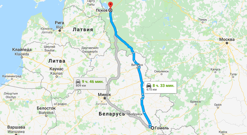 Из Гомеля в Псков проще и быстрее всего доехать на своей машине. Города разделяет 675 км и белорусско-российская граница, которую я достаточно быстро пересекаю в пункте пропуска «Езерище». Путь из Гомеля до Пскова на машине я проезжаю где-то за 9 часов.