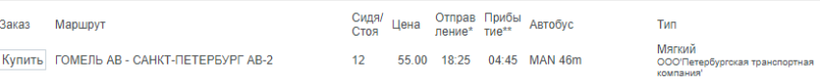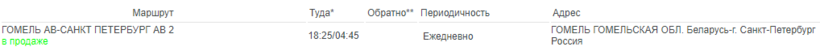 Ежедневно из Гомеля в 18:25 отправляется прямой автобус в Санкт-Петербург, который едет через Псков и преодолевает путь до него за 9,5 часов.