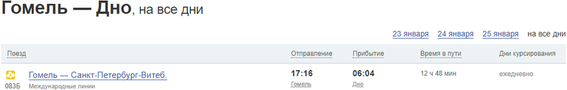 Ежедневно из Гомеля в 17:16 отправляется поезд «Гомель — Санкт-Петербург», который почти за 13 часов доезжает до станции Дно (прибытие в 06:04 утра).