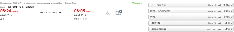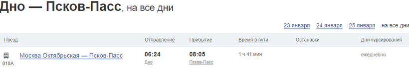 А в 06:24 ежедневно из Дна до Пскова отправляется поезд «Москва — Псков», который путь до Пскова преодолевает всего за 1 час 40 минут.