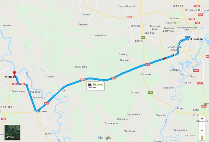 Гомель — Речица — маршрут на карте