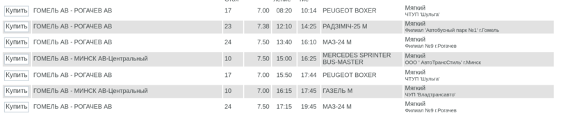 Автобусных рейсов в нужном направлении более чем достаточно. Дабы подобрать для себя наиболее подходящий рейс, рекомендую зайти на официальный сайт по продаже автобусных билетов ticketbus.by. Вот скриншот с расписанием: