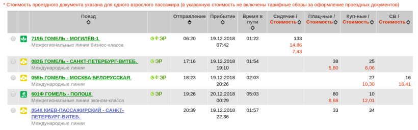 Выше я уже приводил карту, на которой обозначен автовокзал Гомеля. Неподалеку от него находится и железнодорожный вокзал, его тоже видно на карте. Для того, чтобы разобраться с расписанием, я рекомендую посетить сайт железных дорог Беларуси. Вот скриншот на произвольную дату: