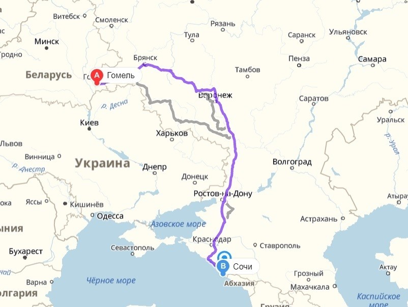 Гомель — Сочи — маршрут на карте
