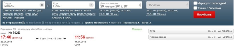 Прямой поезд до Сочи ходит только один раз в три дня. Его номер 302Б. Отправляется он из Гомеля в 17:40. Прибывает в Сочи в 11:56. Таким образом, в дороге нужно провести одни сутки и восемнадцать часов с хвостиком.