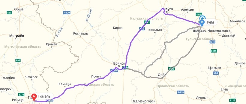 Гомель — Тула — маршрут на карте