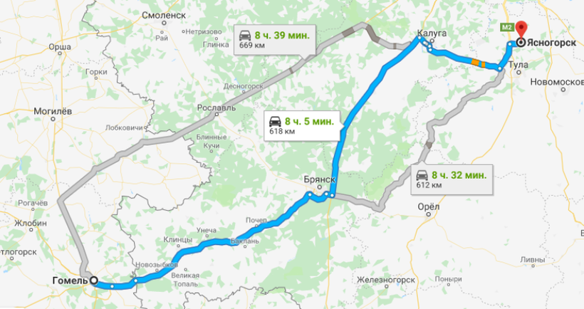 Путь из Гомеля до границы лежит по трассе М10, и за движение по ней иностранцам нужно будет заплатить 2 евро (150 рублей). Далее от границы маршрут до Ясногорска лежит по дороге А-240 до Брянска, от Брянска до Калуги по Е101, от Калуги до Тулы — по Р-132, а дальше по М2 до самого Ясногорска.