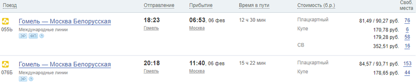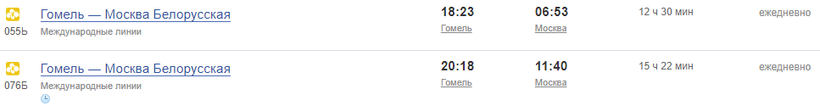 - выезд из Гомеля в 18:23 и прибытие в Москву в 06:53 (Москва-Белорусская);