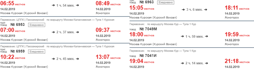 - выезд из Москвы (Москва-Курская) в 10:22 и прибытие в Ясногорск в 13:07.