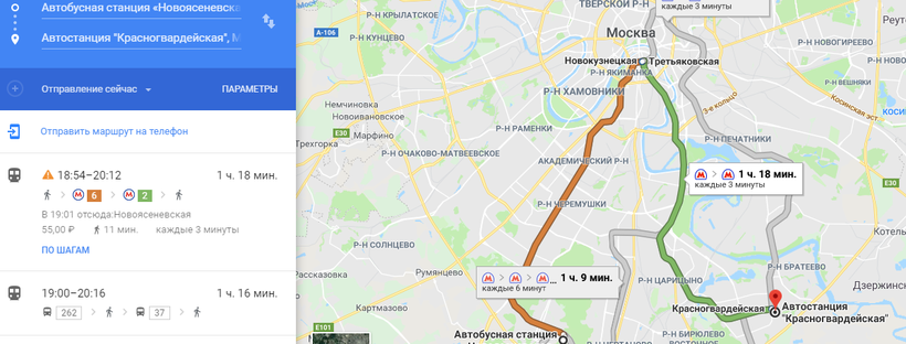 Но выезжают автобусы в Ясногорск из Москвы с автостанции «Красногвардейская», а автобус из Гомеля в Москву прибывает на автостанцию «Новоясеневская». Чтобы попасть с АС «Новоясеневская» на «Красногвардейскую», нужно по оранжевой ветке метро доехать до ст. метро «Третьяковская», затем спуститься на ст. «Новокузнецкая» и по зеленой ветке доехать до АС «Красногвардейская».